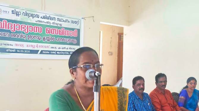 പത്തനംതിട്ട : പത്തനംതിട്ട ഡയറ്റിന്റെ ആഭിമുഖ്യത്തില് ജൈവ വൈവിധ്യ ഉദ്യാനവും ക്ലാസ് തല പഠന സാധ്യതകളും എന്ന വിഷയത്തില് തിരുവല്ല ഡയറ്റ് ഓഡിറ്റോറിയത്തില് നടന്ന സെമിനാര് ജില്ലാ വിദ്യാഭ്യാസ ഉപഡയറക്ടര് പി.എ ശാന്തമ്മ ഉദ്ഘാടനം ചെയ്തു. രാജേഷ് എസ് വളളിക്കോട് സെമിനാറില് വിഷയാവതരണം നടത്തി. ഡോ.ആര്.വിജയ മോഹനന് മോഡറേറ്ററായി. അധ്യാപകര്, ഫാക്കല്റ്റി അംഗങ്ങള് എന്നിവര് ചര്ച്ചയില് പങ്കെടുത്തു. പൂഞ്ചോല പദ്ധതിയുടെ ഭാഗമായി ജില്ലയിലെ തെരെഞ്ഞെടുക്കപ്പെട്ട സ്കൂളുകളില് ജൈവ വൈവിധ്യ ഉദ്യാനവുമായി ബന്ധപ്പെട്ട് മികച്ച പ്രവര്ത്തനങ്ങള് നടത്തിയതിന്റെ റിപ്പോര്ട്ട് അവതരിപ്പിച്ചു. ജില്ലയിലെ എല്ലാ സ്കൂളുകളിലും ജൈവ വൈവിദ്ധ്യ ഉദ്യാനങ്ങള് സംരക്ഷിക്കപ്പെടുകയും അവ പാഠഭാഗങ്ങളുമായി ബന്ധപ്പെടുത്തി മികച്ച പ്രവര്ത്തനങ്ങള് നടത്തണമെന്നും സെമിനാറില് അഭിപ്രായം ഉയര്ന്നു. ഡയറ്റ് പ്രിന്സിപ്പാള് പി.ലാലിക്കുട്ടി, എസ്.എസ്.കെ ജില്ലാ പ്രൊജക്ട് കോഓര്ഡിനേറ്റര് കെ.വി അനില്, സീനിയര് ലക്ചറര് പി.ആര് രാജേന്ദ്രന്, ലക്ചറര് ഗ്ലിന്സി മാത്യൂ എന്നിവര് സംസാരിച്ചു.