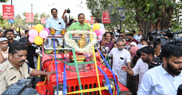 രാവിലെ ജില്ലാപഞ്ചായത്തിന്റെ നേതൃത്വത്തിൽ ജില്ലാ അതിർത്തിയായ മാഹിയിൽ വാദ്യമേളങ്ങളുടെ അകമ്പടിയോടെയാണ് മന്ത്രി രാമചന്ദ്രൻ കടന്നപ്പള്ളിയുടെ നേതൃത്വത്തിൽ വിദ്യാർഥികളെ സ്വീകരിച്ചത്. ജില്ലാപഞ്ചായത്ത് പ്രസിഡന്റ് അഡ്വ ബിനോയ്‌ കുര്യൻ അധ്യക്ഷനായി. വൈസ് പ്രസിഡന്റ് ടി.ശബ്ന, സ്ഥിരംസമിതി അധ്യക്ഷൻമാരായ എ പ്രദീപൻ, പി രവീന്ദ്രൻ, ബോബി എണ്ണച്ചേരി, അംഗങ്ങളായ കെ അനുശ്രീ, പി പ്രസന്ന, സി.കെ മുഹമ്മദലി, പി.വി ജയശ്രീ, ന്യൂമാഹി പഞ്ചായത്ത് പ്രസിഡന്റ് അർജുൻ പവിത്രൻ, വൈസ് പ്രസിഡന്റ് എം.കെ സെയ്ത്തു, ജില്ലാ വിദ്യാഭ്യാസ ഉപഡയറക്ടർ ഡി. ഷൈനി, ജില്ലാ വിദ്യാഭ്യാസ ഓഫീസർ പി ശകുന്തള, എസ് എസ് കെ ജില്ലാ കോ ഓർഡിനേറ്റർ ഇ വിനോദ്, വിദ്യാകിരണം ജില്ലാ കോ ഓർഡിനേറ്റർ കെ.സി സുധീർ, കലോത്സവം ജില്ലാ പ്രോഗ്രാം കൺവീനർ കെ പ്രകാശൻ, പാനൂർ എ ഇ ഒ ബൈജു കേളോത്ത്, ചൊക്ലി എ ഇ ഒ ബാബുരാജ്, കണ്ണൂർ ഡയറ്റ് പ്രിൻസിപ്പൽ ഇൻ ചാർജ് ജയദേവൻ, ന്യൂമാഹി എം എം ഹയർ സെക്കൻഡറി സ്കൂൾ പ്രിൻസിപ്പൽ കെ പി റീത്ത എന്നിവർ പങ്കെടുത്തു.